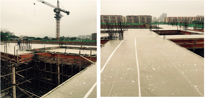 游泳池底板标高从3.300~1.900随坡降,层高从6.45~5.05m随坡降,梁主要截面有:400×700、500×900、500×1000,板厚250mm;游泳池上口四周板面标高4.950,其中3-5~3-11至3-M~3-N轴部位为高支模区域,面积为708.6m2,地下室底板面至板顶面高度为8.1m(-3.150~4.950),梁主要截面有:400×700、400×900,板厚120mm。