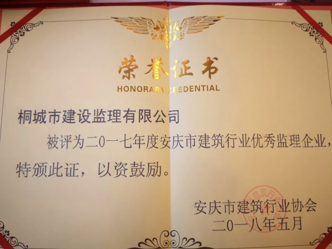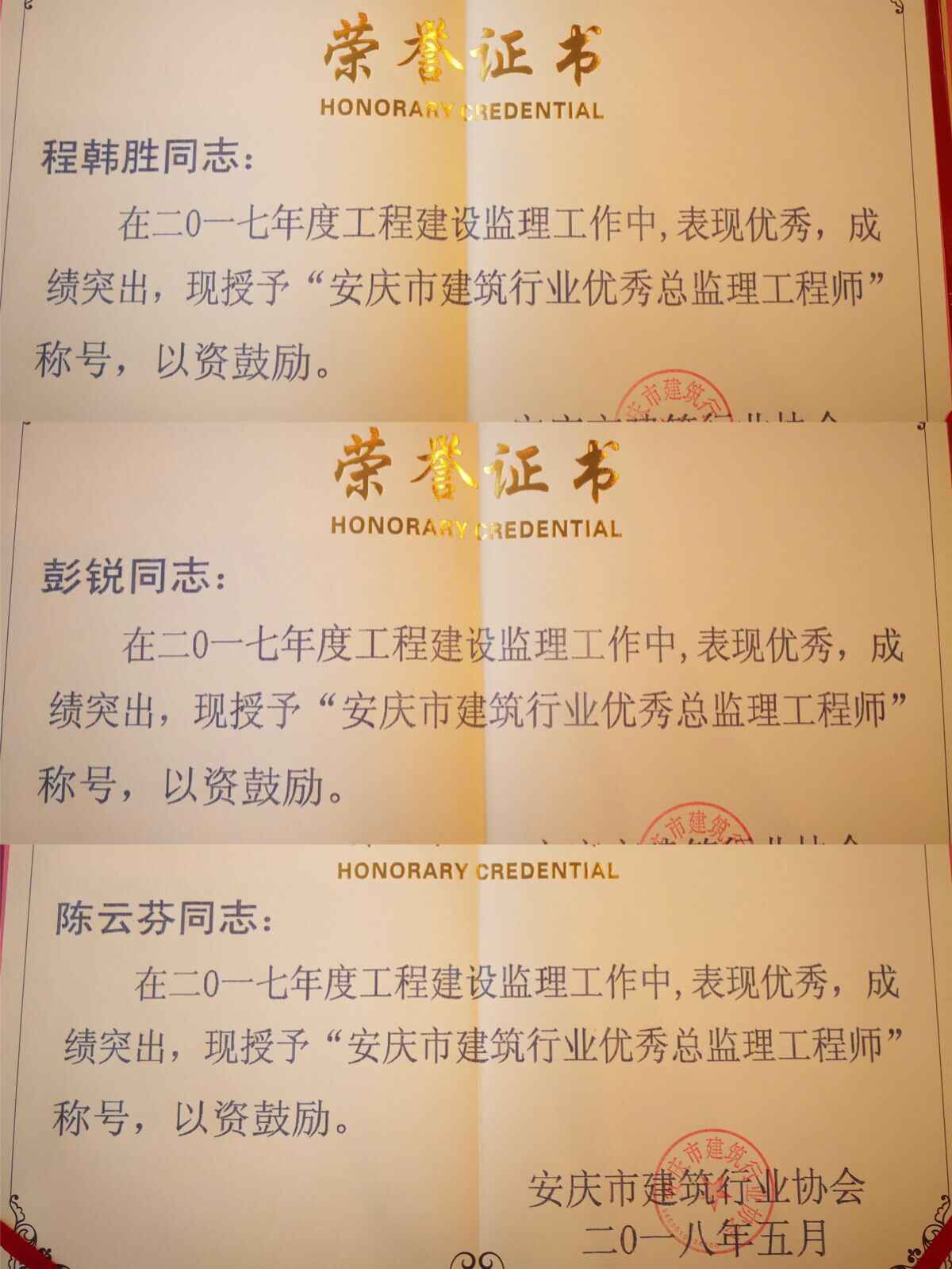 会上,安庆市建筑业协通报表彰了2017年度优秀建筑(监理)企业、优秀项目经理和优秀总监。此次,我单位被评为2017年度安庆市建筑行业优秀监理企业;程韩胜、彭锐、陈云芬被评为优秀总监。