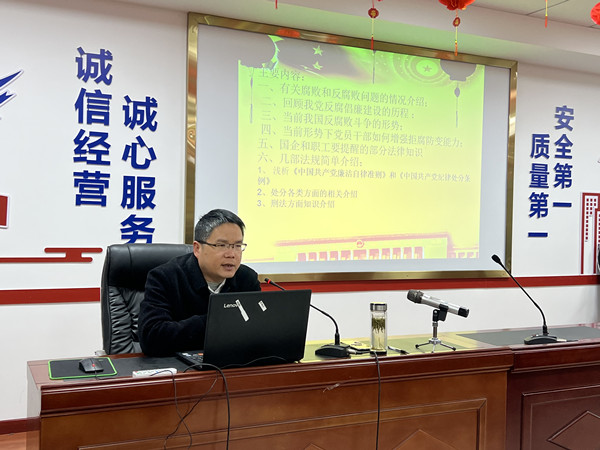 主讲人结合自身多年的纪检监察工作经验,从回顾我党反腐倡廉建设的历程、我国反腐败斗争的形势、当前形势下党员干部如何增强拒腐防变能力、国企和职工要知晓的有关法律知识等几个方面,向我们讲解了现形势下反腐的力度和重要性,让我们明确树立好自己的三观。同时结合我公司的工作大环境,从“赌博、借贷、担保、酒驾、合同的规范签订”等等方面,结合大量的真实案例进行了剖析,作出善意提醒,为全体党员、干部职工上了一堂生动的警示教育课,达到了以案说法、以案为戒、长鸣警钟的良好效果。